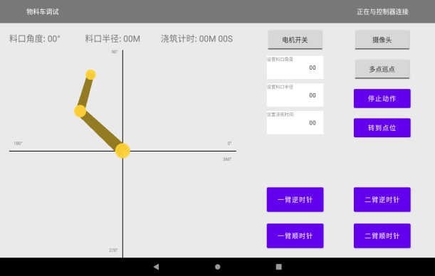 • 借助APP可實(shí)時(shí)監(jiān)測各臂架回轉(zhuǎn)角度、澆筑半徑、巡點(diǎn)進(jìn)度、電磁閥狀態(tài)及系統(tǒng)報(bào)警信息,并實(shí)時(shí)查看出料口視頻影像,全程可視、可控。