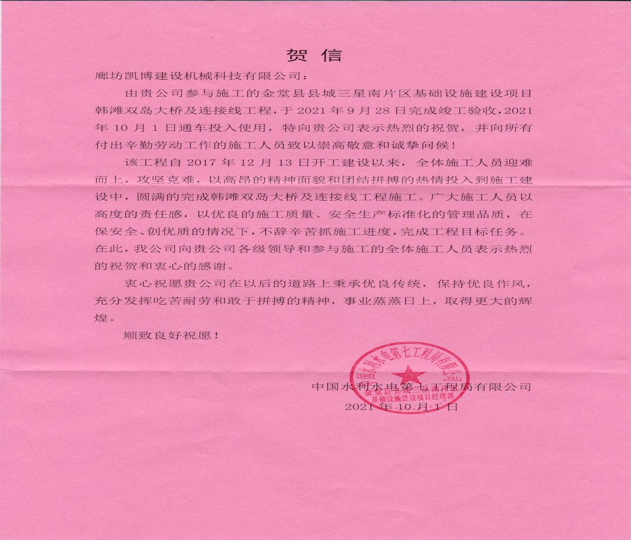 中國水電七局邀請我公司參加了金堂大橋的通車儀式、贈送紀(jì)念品,并專門發(fā)來賀信,對我公司在項目合作中的支持配合與辛勤付出表示衷心感謝。